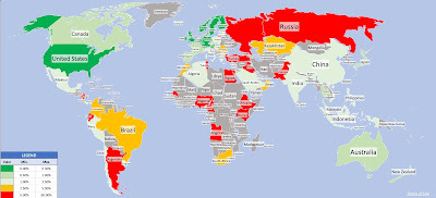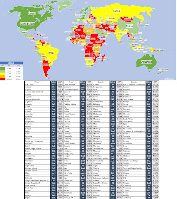 Comparing the sovereign CDS spread picture to the sovereign ratings picture, you can see the overlaps, with the ratings agencies and CDS market mostly in agreement.