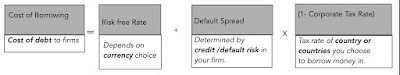 Almost all of the discussion so far has been about equity funding and its costs, but companies do raise funds from debt. While I will use a future post to talk about how debt levels changed in 2022, across the world, I want to talk about the cost of debt in this one. Specifically, the cost of debt for a company is the rate at which it can borrow money, long term, and today, and not the cost of the debt that is already on its books. The build up to a cost of debt is simple: