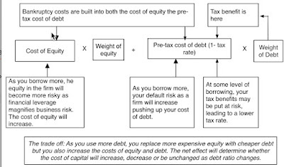 As companies raise money from both debt and equity, they face an overall cost of funding, which will reflect how much of each component they use, and the resulting number is the cost of capital. The picture below illustrates the linkages between the costs of equity and debt, and how as you borrow more, the effects on cost of capital are unpredictable, pushing it down initially as you replace more expensive equity with cheaper debt, but then pushing it up as the negative effects of debt offset its benefits: