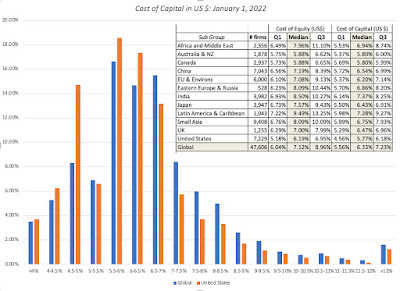 At the start of 2022, the median global company has a cost of capital of 6.33%, in US$ terms, and the median US company has a cost of capital of 5.77%. (To convert these values into other currencies, use the approach that I used in the last post, of adding differential inflation to the number).
