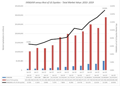If you tally the winners and losers in the stock market sweepstakes between 2010 and 2019, it is undeniable that the decade belonged to the FANGAM stocks, as can be seen in the graph, where I chart the collective market cap of these six companies against the collective market cap of all US equities, and report on their percentage share: