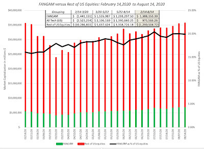Over the course of the decade (2010-2019), the FANGAM stocks increased in collective market capitalization from $719 billion from $5.07 trillion, and their share of the overall equity value of all US stocks also surged from 6.5% to 14.9%. It is not hyperbole that without these stocks, the last decade would not have been a great one for US equities. Coming into 2020 in a position of strength, these companies got stronger, as COVID rocked economies and markets in 2020, which became the headline for one of my posts on COVID: