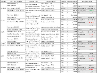 Converting these stories into numbers, I revalued the six companies. You can download the full valuations by clicking here (Facebook, Amazon, Netflix, Google, Apple, Microsoft), but the summary of my key assumptions and valuations are below: