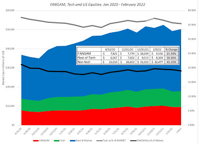 In the eighteen months since I valued these companies, much has happened, to the economy, to US equities collectively, and to these six companies, in specific. In the graph below, I report on the collective market capitalization of US equities, broken down into three groupings, the FANGAM stocks, all other US tech companies and the rest of the US equity market, from August 31, 2020 to February 9, 2022: