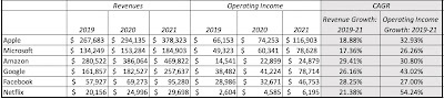 Since I last valued the FANGAM stocks in September 2020, there have been six quarterly earnings reports from each of these companies, and I report on two key operating measures, revenues and operating income, in the table below, for the last three fiscal years for each of the companies. (Note that four of these companies have calendar year-ends, and two have fiscal years that end mid-year. For the latter, I am reporting on the trailing 12-month numbers, to ensure that I have the calendar year numbers.)