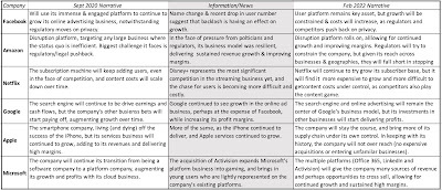 In the trading game, where pricing is driven by mood and momentum, earnings reports and news stories are scanned for incremental news, information that ultimately will have little effect on value, but can move prices substantially. That explains the fixation with earnings per share expectations, and why seemingly trivial surprises, where a company beats or falls short of earnings expectations by a few cents can cause the market capitalization of a company to increase or decrease significantly. If you have been reading my posts, it should come as no surprise to you that I believe in intrinsic value, but I also believe that intrinsic value is driven by narrative. To me, the value effect of earnings reports and news stories comes from how they change (or don't change) the core narratives for companies. In keeping with that belief, I revisited my narratives for the FANGAM stocks, with the intent of revising these narratives, based upon what we have learned about these companies in the last two years:
