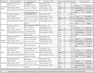 Facebook looks the most under valued of the six companies, but one reason is that it seems to have lost its story script. For a decade whether you liked or hated the company, the story that drove its valuation was a simple one: a platform of billions of users, about whom Facebook knew a great deal, and they then used that knowledge to deliver focused advertising. In short, this is a company that has built its business on accessing and using private data, and the privacy backlash seems to have finally led the company to try to redefine itself, first by renaming itself (Meta), and then muddying the waters about its business model. I think that the company is still a profit-generating behemoth, with some of the highest operating margins in American business, but I think that until it finds a cohesive story line, the price recovery will be stilted.Netflix is the most overvalued company in the mix, even after its major price knock down, after the last earnings report. The company has upended the entertainment business and made everyone else in the business play the game their way, but it has always been on a hamster wheel, where its primary sales pitch to investors is its capacity to keep growing its subscriber base, and the only way it can keep doing this is by spending ever-increasing amounts of money of new content. The question of how the company would get off this hamster wheel has always been there, and now that user numbers are starting to slow, and new users are becoming more costly to acquire, the challenge of doing so has become larger. Microsoft and Apple have kept their heads low, as the rest of the FANGAM stocks have been buffeted by controversy and blowback. Apple seems to have found a way to be one of the good guys in the privacy battle, and in the process, intentionally or not, it has helped deliver punishment to others (like Facebook) in this rarefied group. For Microsoft, buying Activision advances them further towards becoming a premier platform business, and the company's diverse platforms (Office 365, LinkedIn and now Activision) offer the potential for growth and sustained high margins.Google surprised me the most, delivering high growth and increased margins, suggesting that Facebook’s problems are its own, and that Google continues to steamroll its online advertising competition. The other bets at Google continue to be cash-draining investments that deliver little in value, and after six years, I am not sure that they will be ever be big value creators, but that search box is the gift that keeps on giving.Amazon has, for much of its life, been a Field of Dreams company, offering investors a promise of revenues now, and if they wait patiently, profits in the future. For the first decades of its existence, all that investors saw was revenue growth, but margins remained slim to non-existent. In the last five years, Amazon’s margins have climbed and the company is solidifying its profit pathway, and while regulators and governments will try to rein it in, its mix of businesses and geographies will make it difficult to legislate against.I came into the analysis holding Microsoft, and I will continue to hold it, though it is mildly over valued. If I still had Apple in my portfolio, I would also hold it, but since I don’t own it now, I have to wait for a price dip, and when it comes, I will buy it. I used to own Facebook, and while I sold it on its name-change, I will be getting back into the stock, at current prices, notwithstanding its muddled story line and near-term troubles, simply because of its cheapness. On Amazon, a stock that I have bought and sold four times over the last twenty years, I am glad to add it back to my portfolio. As for Google, I have never held it, to my regret, and don't plan to add it on, at the current stock price. Finally, I just don’t like Netflix, even at depressed prices, since I believe that scaling down content costs, key to the company's future success, has become more difficult, not less, after the entry of Disney into the streaming wars. Needless to say, there is the broader question of the overall market, and how inflation will play out this year, but the answer to that question has a bigger effect on my overall asset allocation than on my judgment on whether to buy any of these stocks.YouTube Video