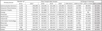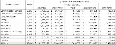 For non-financial service firms, the gross profit is a measure of what companies earn on the products/services that they sell, net of what it costs them to produce those products/services. Netting out other operating expenses, that are not directly tied to producing the goods and services (such as selling and G&A expenses), from gross profits, yields operating income. Income from financial holdings (including cash balances, investments in financial securities and minority holdings in other businesses) are added back, and interest expenses on debt are subtracted out to get to taxable income. After paying taxes on this income, the residual amount represents net income, the final measure of equity earnings, and the basis for computing earnings per share and other widely used measures of profitability used by equity investors. Looking across all publicly traded companies, listed globally, and aggregating revenues on all four measures of earnings (gross, operating, taxable, net), by sector, and aggregating the numbers yields the following: