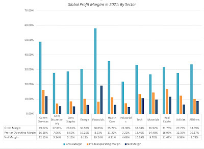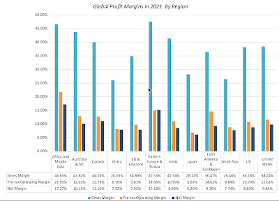These sectors obviously are broad and each covers a range of industries. If you are interested in industry-level margins, you can find them at this link. In the graph below, I look at differences in margins across geographical regions: