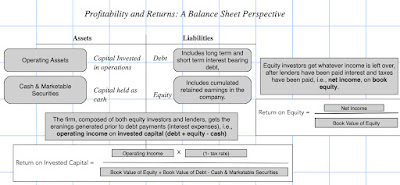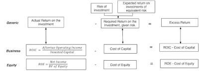 The Value of Growth As investor tastes have shifted from earnings power to growth, there has been a tendency to put growth on a pedestal, and view it as an unalloyed good, but it is not. In fact, growth requires trade offs, where a company invests more back into itself in the near term, denying payouts (dividends or buybacks) to its investors, during that period, for higher earnings in the future. Not surprisingly, then, the net effect of growth will depend on how much is reinvested back, relative to what the company can harvest as future growth. While a full assessment of this value will require making explicit assumptions about growth and reinvestment, there is a short hand that is useful in making this assessment, and that is a comparison of the returns that a company makes on its investments to the cost of funding those investments. If you use accounting returns as a proxy for project returns, and the costs of equity and capital as measures of the costs of funding, you can compute excess returns to equity investors, by comparing return on equity to the cost of equity, and excess returns to all capital providers, by netting cost of capital from return on invested capital:
