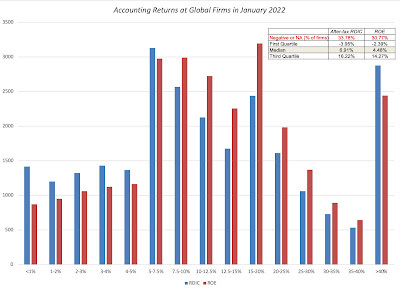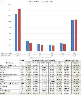 As with margins, almost a third of all firms have negative or missing accounting returns and the median return on equity, in US dollar terms, across all global firms is 4.48%, and the median return on invested capital, in US dollar terms, across firms is 6.91%. In my last post, I noted the decline in costs of capital for firms over time, noting that the median cost of capital at the start of 2022 is only 6.33%, across global firms, and argued that companies that demand double-digit hurdle rates risk being shut out of investments. That point is amplified by the accounting returns computations, since it looks like the actual returns earned by firms on their investments don't meet their own expectations.