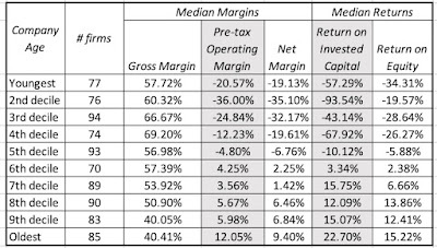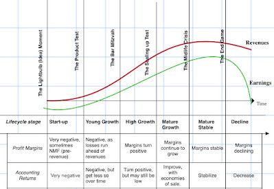 A Life Cycle ViewIf you have been reading my posts for a while, you know that I find the corporate life cycle a useful device in explaining everything from what companies should focus on, in corporate finance, to the balance between stories and numbers, when investor value companies. Profit margins and returns also follow the life cycle, albeit with wide differences across firms: