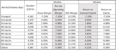 As you can see, young companies tend to be money-losers, and margins improve as companies make it through to maturity, before dropping as companies decline. Accounting returns follow a similar path, though they tend to peak a little later in the cycle, before declining in the last stages of the life cycle again. I am aware that there are many who disagree with my life cycle view of companies, but one way of testing whether it is a reasonable approximation of the real world is to look at the data. In the table below, I report on profit margins and accounting returns for firms, broken down by corporate age (measured from the founding year to 2021), across global companies at the start of 2022: