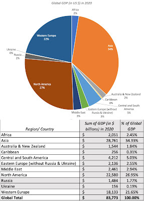 To understand the market effects of the Russia-Ukraine conflict, we need to start with an assessment of the two countries, and their places in the global political, economic and market landscape, leading in. Russia was undoubtedly a military superpower, with its vast arsenal of nuclear weapons and army, but economically, it has never punched that weight. Ukraine, a part of the Soviet Union, has had its shares of ups and downs, and its economic footprint is even smaller. The pie chart below, provides a measure of the gross domestic product of Russia and Ukraine, relative to the rest of the world: