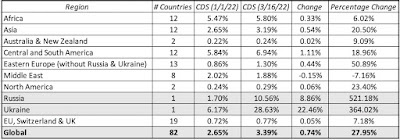 The sovereign CDS spread for Russia, which started the year at 1.70% soared above 25%, just after hostilities commenced, and were trading at 10.56% on March 16, after rumors that peace talks were underway brought them down. The sovereign CDS spread for the Ukraine started the year at 6.17% and climbed in the first few days of the crisis to more than 100% (effectively uninsurable) before settling in on March 16 at 28.62%. Even the ratings agencies, normally slow to act, have been moving promptly, with Moody's lowering Russia's rating from Ba2 to B3 on March 3, from B3 to Ca on March 6 and from Ca to C on March 8, and Ukraine's rating from B3 to Caa2 on March 4. Other ratings agencies have also taken similar actions. The worries about default have not stayed isolated to Russia and Ukraine, as ripple effects have shown up first in the countries that are geographically closest to the conflict (Eastern Europe) and more generally on sovereign CDS spreads in the rest of the world. The graph below looks at average spreads, by region, before and after the hostilities started: