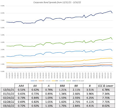 It is worth noting that corporate bond spreads, which were are at historic lows to start the year, were already starting to widen before Russia's military moved into the Ukraine on February 24, 2022, but the invasion has pushed the spreads further up at the lower ends of the default spectrum. The overriding message in all of this data is that Russia/Ukraine war has unleashed fears in the bond market, and once unleashed that fear has pushed up worries about default and default risk premia across the board.
