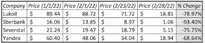 Neither index is particularly representative, and currency effects contaminate both, but they tell the story of devastation in the two markets. In fact, since trading has been suspended on both indices, the extent of the damage is probably understated. To get a better sense of how Russian equities, in particular, have fared in the aftermath of the invasion, I looked at four higher profile Russian companies,: