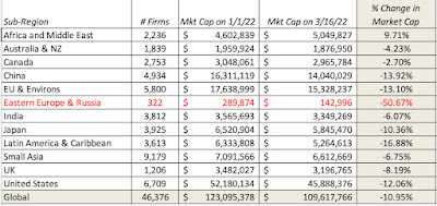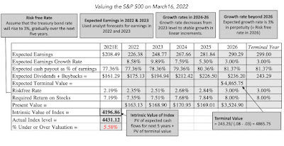 The Russian invasion of Ukraine has undoubtedly increased uncertainty, affected prices for financial assets and commodities and exacerbated issues that were already roiling markets prior to the invasion. For investors trying to recapture their footing in the aftermath, there are multiple questions that need answers. The first is whether a radical shift in asset allocation is needed, given how these perturbations, across asset classes, geographies and sectors. The second is how the disparate market sell off, small in some segments and large in others, over the last few months has altered the investment potential in individual companies in these segments. On January 1, 2022, I valued the S&P 500, building in the expectation that the economy would stay strong for the year and that interest rates would rise over the course of time from the then prevailing value (1.51%) to 2.50% over five years, and arrived at a value of 4,320 for the index, about 10.3% lower than the traded value of 4766. While that was only ten weeks ago, the index has since shed 7.03% of its value, the T.Bond rate has risen to 2.19% and Russia's invasion of the Ukraine have increased commodity prices and the likelihood of a recession. I revisited my valuation of the index, with the updated values: