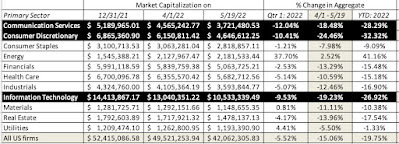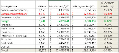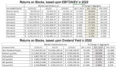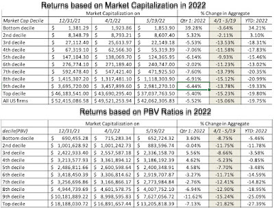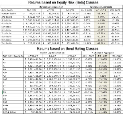 In 2022, the collective market capitalization of all US firms has dropped by 19.75%, with the bulk of the drop occurring after April 1, 2022. During the period (April 1- May 19, 2022), the three worst performing sectors (highlighted) were technology, consumer discretionary and communication services, and the best performing sectors were energy (no surprise, given the rise in oil prices) and utilities, old standbys for investors during tumultuous periods.