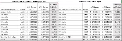 To check to see if the outperformance of small cap and low price to book ratios that we saw in the 1970s is being replicated in 2022, I broke companies down by decile (based on market cap and price to book at the start of 2022), and looked at changes in aggregate value in 2022: