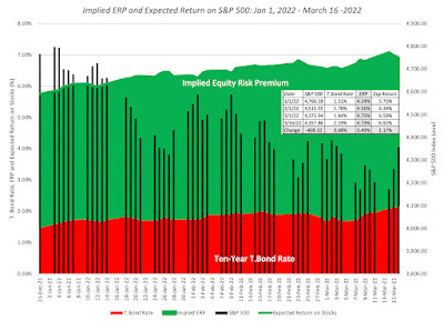 In this crisis, the conventional wisdom has held, at least so far, with mature companies holding their values better than growth companies. Since these mature companies tend to carry more debt, you see more indebted companies doing much better than less indebted companies. While the value crowd, bereft of victories for a long time, may be inclined to do a victory dance, it is worth noting that the same phenomenon occurred between February and March of 2020, at the start of the COVID crisis, but that growth companies quickly recouped their losses and finished ahead of mature companies by the end of 2020. In keeping with my belief that it is the price of risk that is changing during a crisis, causing contortions in prices, I estimated the implied equity risk premium for the S&P 500, by day, starting on January 1, 2022, going through March 16, 2022, in the graph below: