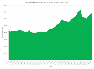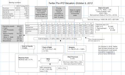 In keeping with my belief that every valuation tells a story, my IPO valuation of Twitter in October 2013 reflected my story for the company, as a platform with lots of users, that had not yet figured out how to monetize them, but would do so over time. My forecasted revenues for 2023 of $11.2 billion and predicted operating margin of 25% in that year reflected my optimistic take for the company, with substantial reinvestment (in acquisitions and technology) needed along the way (as seen in my reinvestment). A few weeks later, the offering price for Twitter's shares was set at $26, by its bankers, and the stock debuted on November 7, 2013, at $45. In the weeks after, that momentum continued to carry the stock upwards, with the price reaching $73.31 by December 26, 2013.