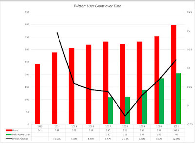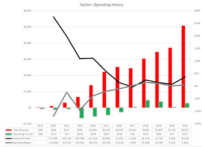 Twitter was founded in 2006 by Jack Dorsey, Noah Glass, Biz Stone and Evan Williams, and its platform was launched later that year. It succeeded spectacularly in attracting people to its platform, hitting a 100 million users in 2012, and then doubling those numbers again by 2013, when it went public ,with an initial public offering. In a post on this blog on October 5, 2013, I valued Twitter, based on the numbers in its prospectus: