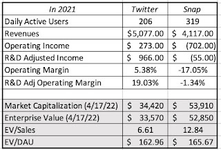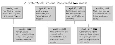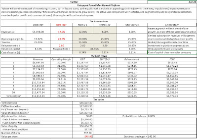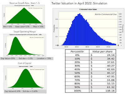 I am not a prolific user of social media platforms, completely inactive on Facebook and a casual lurker on LinkedIn, but I do use Twitter occasionally, and have done so for a long time, with my first tweet in April 2009, making me ancient by Twitter standards. That said, I tweet less than ten times a month and follow only three people (three of my four children) on the platform. I am also fascinated by Elon Musk, and even more so by his most prominent creation, Tesla, and I have valued and written about him and the company multiple times. When Musk made news a little over two weeks ago, with his announcement that he owned a major stake in Twitter, I could not stay away from the story, and what's happened since has only made it more interesting, as it casts light on just Musk and Twitter, but on broader issues of the social and economic value of social media platforms, corporate governance, investing and how politics has become part of almost every discussion.