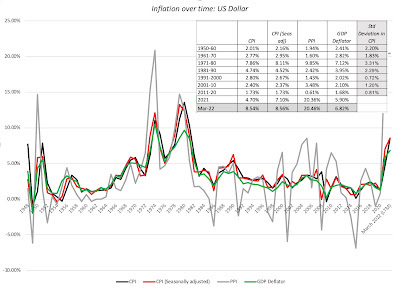 While I report multiple measures of inflation, from the consumer price index (adjusted and unadjusted) to the producer price index, to the price deflator used in the GDP, they all tell the same story. We have had a long stretch of low and stable inflation, and that is especially true since the 2008 crisis. In fact, the average inflation rate in the 2011-20 decade was the lowest of the seven decades that I cover in this chart. Just as important, though, is the fact that variation in inflation, from year to year, was lower in 2011-2020 in every other decade, other than 1991-2000. It reinforces a point I made in my inflation post last year, where I argued that to understand inflation's impact on asset values, you have to break it down into its expected and unexpected components, with the former showing up in the expected returns you demand on investments, and the latter playing out as a risk factor.