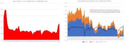 It is precisely because we have been spoiled by a decade of low and stable inflation that the inflation numbers in 2021 and 2022 came as such a surprise to economists, investors and even the Fed. Early on, the inflation surge was explained away by the reopening of the economy, after the COVID shutdown, and then by stressed supply chains, and expectations about future inflation stayed low. However, as reported inflation has remained stubbornly high, and neither COVID nor supply chains provided sufficient rationale, market expectations of inflation have started to go up. I capture this shift using two measures of expected inflation, the first coming from the University of Michigan's surveys of consumer expectations of inflation for the future and the latter from the US Treasury market, as the difference between the ten-year treasury bond and the ten-year inflation-protected treasury bond (TIPs) rates: