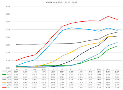 As inflation, actual and expected, has made a return, it is not surprising that the ripple effects are being felt across the economy, with the ripples sometimes resembling tidal waves. The most direct effects have been on interest rates, where we have seen rates rise quickly, and to levels not seen in years. In the chart below, I look at how the treasury curve has shifted in the recent periods: