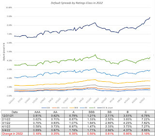 To provide a sense of how much rates have changed just in 2022, compare the yield curve on January 1, 2022 to the one on May 5, 2022. On January 1, 2022, the yields on the very short end of the maturity spectrum (1-6 month treasuries) were close to zero, the ten-year treasury bond rate was 1.51% and the long end of the yield curve had an upward slope. On May 5, 2022, the treasury yields for the short end had risen, with the 1-month rate reach 0.50%, the ten-year treasury bond rate had breached 3% and the term structure had leveled out for the long end of the spectrum (with the 2-year yield moving towards the 10-year yield, which in turn was close to the 20-year and 30-year yields). Of course, the "Fed did it" crowd will argue that this is all Jerome Powell's doing, an indication of how little they understand about both what rates the Fed does control (the Fed Funds rate is at the very shortest end of the spectrum, and it is not a trading rate) and how willing they are to ignore the data. If you were to graph out when the Fed woke up from its inflation-denial and when treasury rates started rising, it seems clear that it was the treasury market that is causing the Fed to act, rather than the other way around. As treasury rates have risen, markets also seem to have been more wary about risk, and how it is being priced. In the chart below, I start with the default spreads in the corporate bond market and you can see the increase in spreads that have occurred just over the course of 2022: