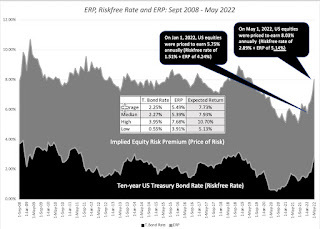 In equity markets, the shift in expected returns has been significant, perhaps even dramatic, as the expected return on stocks, which started 2022 at 5.75%, has moved above 8% for the first time since May 2019, with some of that shift coming from a higher treasury bond rate (1.51% to 2.89%) and some of it coming from a higher equity risk premium (4.24% to 5.14%).