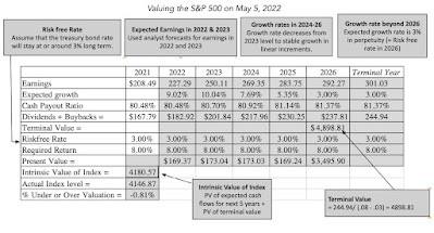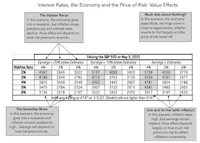 Steady State Interest Rate: As noted in the last section, the ten-year bond rate has doubled this year, an uncommonly large move for US treasuries, and there are three possibilities for the future. The first is that the bulk of the move in rates is behind us, and that treasury rates now reflect updated expectations of inflation. The second is that, like the 1970s, we will play catch up with inflation, and that rates will continue to move up, until expectations on inflation become more realistic. The third is that inflation is either transient, and will revert back to the lows we saw last decade, or that the economy will go into a recession and act as a natural break on inflation and interest rates. Note that in all three cases, it is not the Fed that is driving rates, but what is happening to inflation.Equity Risk Premium Path: The equity risk premium of 5.24%, estimated at the start of May 2022, is at the high end of historical equity risk premiums, but we have seen higher premiums, either in crises (end of 2008, first quarter of 2020) or when inflation has been high (the late 1970s). I think that what happens to equity risk premiums for the rest of the year will largely depend on inflation numbers, with high and volatile inflation continuing to push up the premium, and steadying and dropping inflation having the opposite effect.Earnings Estimates: The strength of the economy has been a big contributor to boosting actual and expected earnings on companies in the last two years, and these higher earnings have translated into more cash returned in dividends and buybacks. The earnings estimates for the S&P 500 companies from analysts, at the start of May 2022, reflect that strength and there seems to have been no adjustment downwards for a recession possibility. That may either reflect the fact that equity analysts are not among those who expect a recession (or expect only a very mild one, with little impact on earnings) or the possibility that there may be a lag in the process between the economy weakening and analysts adjusting expected earnings.To see how these three forces play out, consider what I would term the status quo scenario, where you assume that today's treasury bond rate (3%) is the steady state, that earnings estimates will largely be delivered and that the equity risk premium will stabilize around current levels: