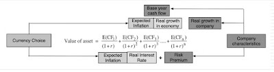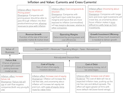 When in doubt about how any action or information plays out in value, I find it useful to go back to value basics, and trace out the effects of that action/information on value drivers. Following that rule book, I looked at the effects of inflation on the levers that determines value, in the graph below: