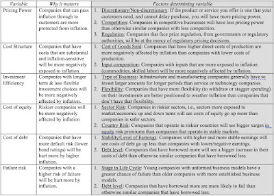 In my last post, I discussed how inflation's return has changed the calculus for investors, looking at how inflation affects returns on different asset classes, and tracing out the consequences for equity values, in the aggregate. In general, higher and more volatile inflation has negative effects on all financial assets, from stocks to corporate bonds to treasury bonds, and neutral to positive effects on gold, collectibles and real assets. That said, the impact of inflation on individual company values can vary widely, with a few companies benefiting, some affected only lightly, and other companies being affected more adversely, by higher than expected inflation. In an environment where finding inflation hedges has become the first priority for most investors, the search is on for companies that are less exposed to high and rising inflation. The conventional wisdom, based largely on investor experiences from the 1970s, is that commodity companies and firms with pricing power are the best ones to hold, if you fear inflation, but is that true, and even if it is true, why is it so? To answer these questions, I will return to basics and try to trace the effects of inflation on the drivers of value, with the intent of finding the characteristics of stocks with better inflation-hedging properties.