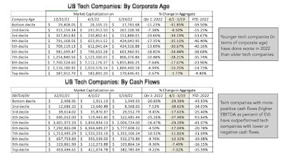 Bottom LineThis has been a painful year for investors in US equities, but the pain has not been evenly spread across investors. Portfolios that are over weighted in risky, money losing companies have been hurt more than portfolios that are more weighted towards companies with less debt and more positive cash flows. Even within some of the worst performing sectors, such as technology, breaking companies down, based upon earnings and cash flows, there is a clear advantage to holding money making, older tech companies than money losing, young tech companies: