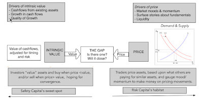 Risk Premiums: The risk premiums that you observe in every risky asset market are a function of how much risk capital there is in play, with risk premiums going up when risk capital becomes scarcer and down, when risk capital is more plentiful. In the bond and loan market, access to risk capital will determine default spreads on bonds, with lower rated bonds feeling the pain more intensely when risk capital is withdrawn or moves to the side lines. Not only will default spreads widen more for lower-rated bonds, but there will be less bond issuances by riskier companies. In the equity market, the equity risk premium is the price of risk, and its movements will track shifts in risk capital, increasing as risk capital becomes scarcer. Price and Value Gaps: As those of you who read this blog know well, I draw a contrast between value and price, with the former driven by fundamentals (cash flows, growth and risk) and the latter by mood, momentum and liquidity. The value and price processes can yield different numbers for the same company, and the two numbers can diverge for long periods, with convergence not guaranteed but likely over long periods.