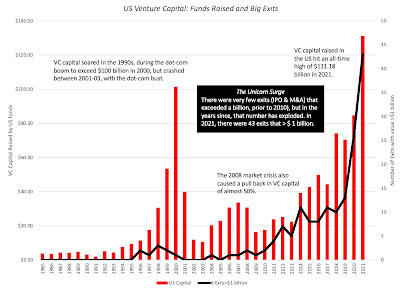 Let’s start with venture capital, the typical source of capital for start ups and young companies for decades in the United States, and more recently, in the rest of the world. In the graph below, I trace out total venture capital raised, by year, between 1995 and 2021, in the US: