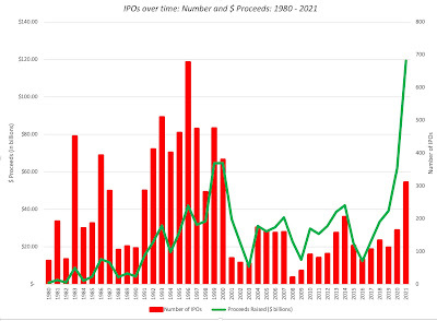 If success in venture capital comes from exiting investments at a higher pricing, initial public offerings represent the most lucrative route, and tracking the number of initial public offerings over time provides a window on the ebbs and flows of risk capital, over long periods. Using data made public by Jay Ritter on IPOs, I track the number of IPO and dollar proceeds from offerings in the graph below from 1980 to 2021: