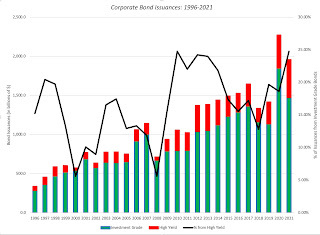 In the final graph, I look at corporate bond offerings, broken down into investment grade and high yield, by year, from 1996 to 2021: