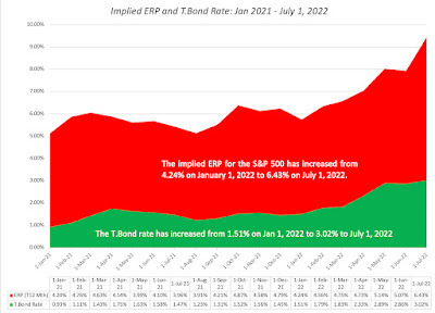 The first half of 2022 has been a trying period for markets, and as inflation has risen, it is having an effect on the availability of and access to risk capital. There has been a pullback in all three proxies for risk capital, albeit smaller in venture capital, than in IPOs and in high-yield bond issuances in the first few months of 2022. That pullback has had its consequences, with equity risk premiums rising around the world. In the graph below, I have updated the equity risk premium for the S&P 500 through the start of July 2022: