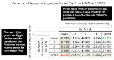As inflation and recession fears have mounted, equity markets are down significantly around the world, but the drop in pricing has been greatest in the riskiest segments of the market. In the table below, I look at the price change in the first six months of 2022 for global stocks, broken down by quintiles, into net profit margin and revenue growth classes: