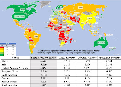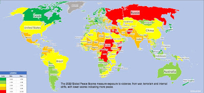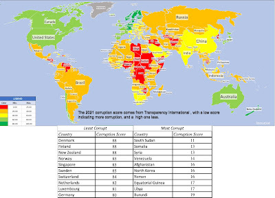 Note that the peace scores were updated to reflect the Russian invasion of Ukraine and that the world's hotspots became more violent in 2021 and 2022. Third, corruption operates as an implicit tax, since business operating in corrupt parts of the world have to build in the associated costs and constraints. Transparency International measures a corruption score for countries, and the results of its 2021 iteration are mapped below: