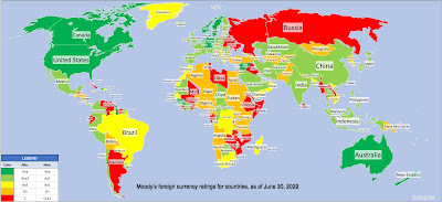 To measure sovereign default risk, ratings agencies (S&P, Moody’s, Fitch) estimate sovereign ratings for countries, designed to capture risk exposure in both local and foreign currency borrowing. The picture below reports on Moody’s ratings, as of June 30, 2022: