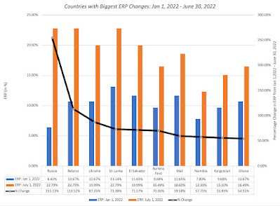 If you compare the numbers in this picture to the equivalent one that I reported at the start of the year, you can see the surge in risk premiums across the board, starting with a higher base premium (6.01%, up from 4.24%) for the US and higher spreads for country risk. Looking at individual countries, the graph below summarizes the countries that saw the biggest increases in equity risk premiums (on a percentage basis) over the six months (from Jan 1, 2022 - June 30, 2022):