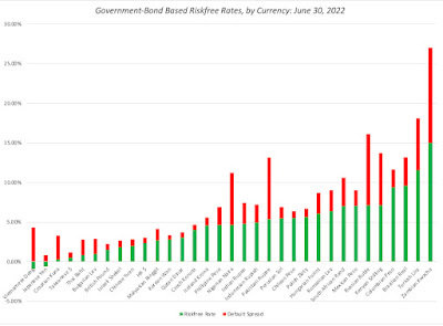 As a final part to this post, to see the shifts in country risk that we have seen in 2022, let’s start with an assessment of risk free rates. In my last post, I noted that concerns about inflation have played a big role in pushing up the US ten-year treasury bond rate from 1.51% on Jan 1, 2022, to 3.02% on June 30, 2022. That increase in interest rates is not restricted to the US dollar, as local currency government bond rates have risen around the world. In the graph below, I use these government bond rates as a starting point to estimate riskfree rates in multiple currencies, with adjustments for default risk in governments, using the sovereign default spreads from the last section: