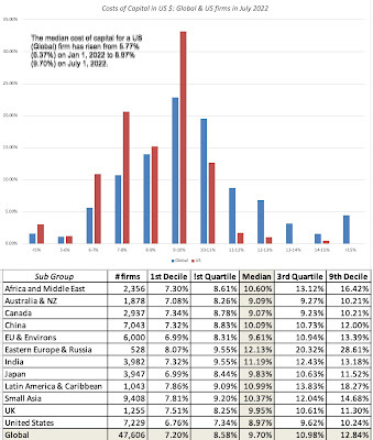 The combination of rising risk free rates (not just in US dollars, but also in other currencies) and surging risk premiums (default spreads and equity risk premiums) is pushing up corporate costs of capital. In the figure below, I graph the costs of capital for US and global firms, in US$ terms, on July 1, 2022: