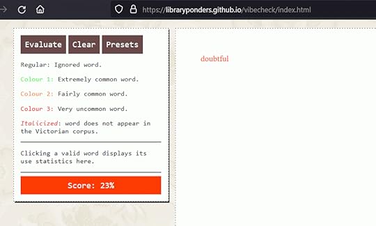 Screenshot of entry to the game, from https://libraryponders.github.io/game.html One final cool resource is the site’s Vibecheck, where you can look up the vocabulary typical of the time period. If you’re a writer keen in setting your novel in the Victorian Era, this resource will be invaluable in helping you get the appropriate period nuances. I tested out the word “doubtful”, and you can see the result below.
