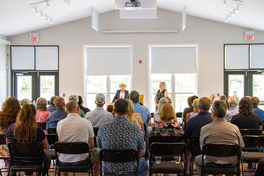 I allowed attendees 10 minutes to arrive before we began the official program. That also gave me time to greet a few of them, but my hubby was on hand as my greeter.My emcee, Charmaine, welcomed everyone and introduce me officially, then conducted an interview with me based on some pre-arranged questions I’d provided her beforehand.After the interview, the audience was invited to ask questions.Following that, I gave a short address to the audience as well as a roughly 10-minute reading from the book. After that, I moved to my author table to sign books that attendees purchased. I had 2 great helpers (and friends), Patti and Debbie, to hand out swag bags and process the payments. Unfortunately I couldn’t get my Square reader to connect, so it was cash only, but I made that as easy as possible by selling copies for $20, which is the denomination that all our ATMs invariably dispense.While that was going on, people could have their photo taken at the photo booth, enjoy refreshments (trays of small sandwiches, charcuterie and pastries), and participate in the travel photo contest if they chose. At 10 minutes before wrap-up, which worked out well because all the signings were done by then, I went through the contest ballots and marked the winner, which I announced to close out the proceedings along with thanks and an invitation to walk the forest.